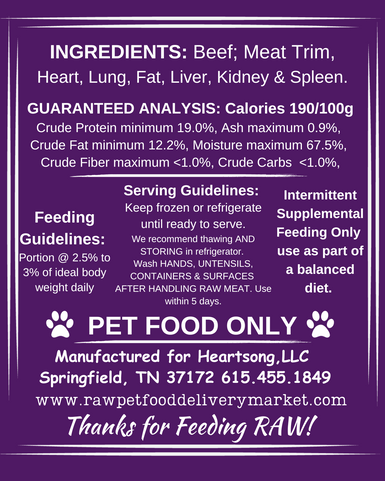 - Beef Meat Combined with 10% organ (5% liver + 5% Kidney, Spleen & Pancreas)