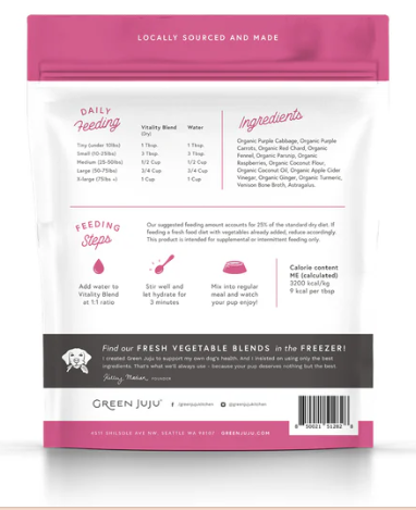 Ingredients: Organic Purple Cabbage, Organic Purple Carrots, Organic Red Chard, Organic Fennel, Organic Parsnip, Organic Raspberries, Organic Coconut Flour, Organic Coconut Oil, Organic Apple Cider Vinegar, Organic Ginger, Organic Turmeric, Venison Bone Broth, Astragulas
